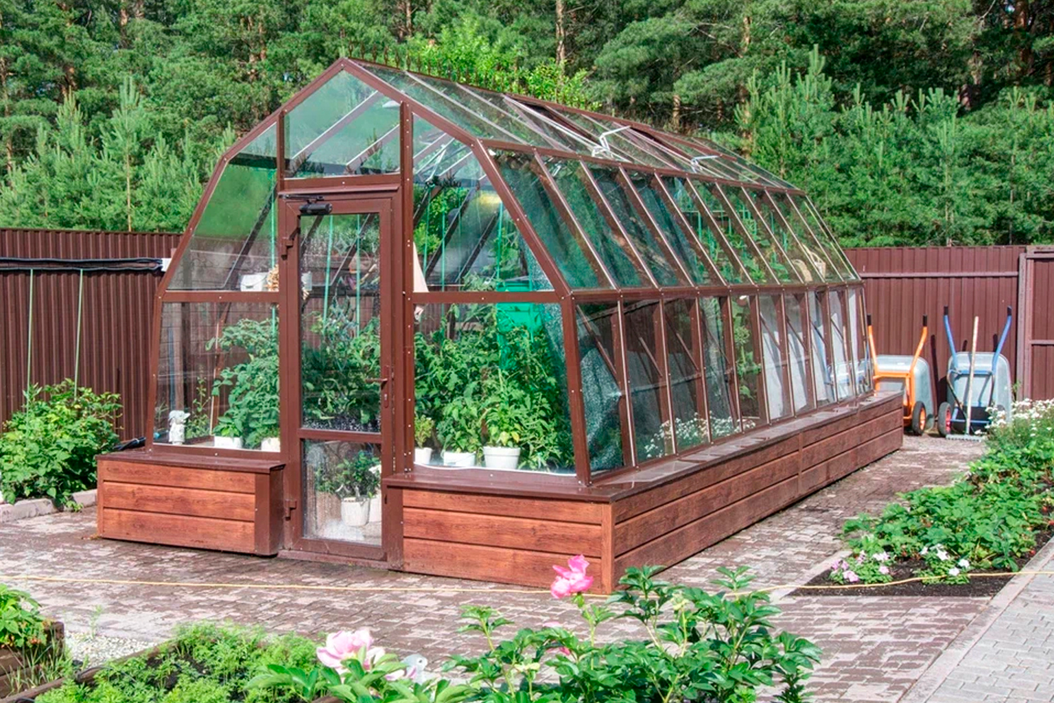 - Что за теплица: представитель классических английских теплиц — сбалансированные пропорции и аккуратная форма.